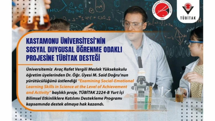 Kastamonu Üniversitesi Araç Rafet Vergili Meslek Yüksekokulu öğretim üyelerinden Dr. Öğr. Üyesi M. Said Doğru'nun yürütücülüğünü üstlendiği 'Examining Social-Emotional Learning Skills in Science at the Level of Achievement and Activity' başlıklı proje, TÜBİTAK 2224-B Yurt İçi Bilimsel Etkinliklere Katılımı Destekleme Programı kapsamında destek almaya hak kazandı.
