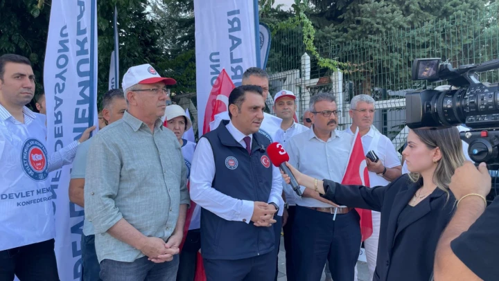 Çalışma ve Sosyal Güvenlik Bakanlığı önünde Devlet Memurları Konfederasyonu ve paydaş sendikaları adına ortak basın açıklamasını TEÇ-SEN Genel Başkanı Ümit Demirel gerçekleştirdi.