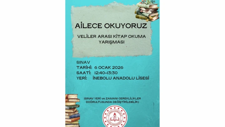 İnebolu Kaymakamlığı'ndan yapılan duyuruda; 'Veliler arası kitap okuma yarışması başlıyor! Kitapların birleştirici gücünü aile ortamına taşımaya hazır mısınız? Okuma kültürünü yaygınlaştırmak, çocuklara örnek olmak ve kitapların büyülü dünyasında keyifli bir yolculuğa çıkmak isteyen tüm velilerimizi Ailece Okuyoruz- Veliler Arası Kitap Okuma Yarışması'na davet ediyoruz! Bu heyecan dolu yarışmada hem bilgilerinizi sınayacak hem de keyifli bir rekabetin parçası olacaksınız. Üstelik 130 veli sınavda yerini alarak kitapların buluşturduğu bu anlamlı yolculuğa ortak olacak. Sınav 6 Ocak 2026 tarihinde saat 12.40-13:30 arasında İnebolu Anadolu Lisesi'nde yapılacak. Unutmayın; okumak sadece bir alışkanlık değil, aynı zamanda geleceğe bırakılacak en değerli mirastır. Siz de bu anlamlı etkinlikte yerinizi alın, çocuklarınıza ilham olun! Haydi veliler, kitapların buluşturduğu bu güzel yolculukta beraber olalım' denildi.