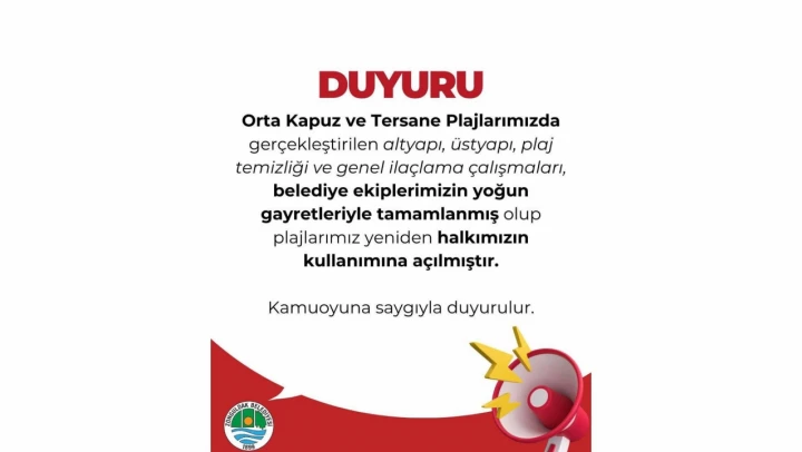 Orta Kapuz ve Tersane Plajlarında altyapı, üstyapı, plaj temizliği ve genel ilaçlama çalışmaları yapıldı. Ekipler tarafından yapılan çalışmalar sonrası 2 plaj hizmete açıldı.