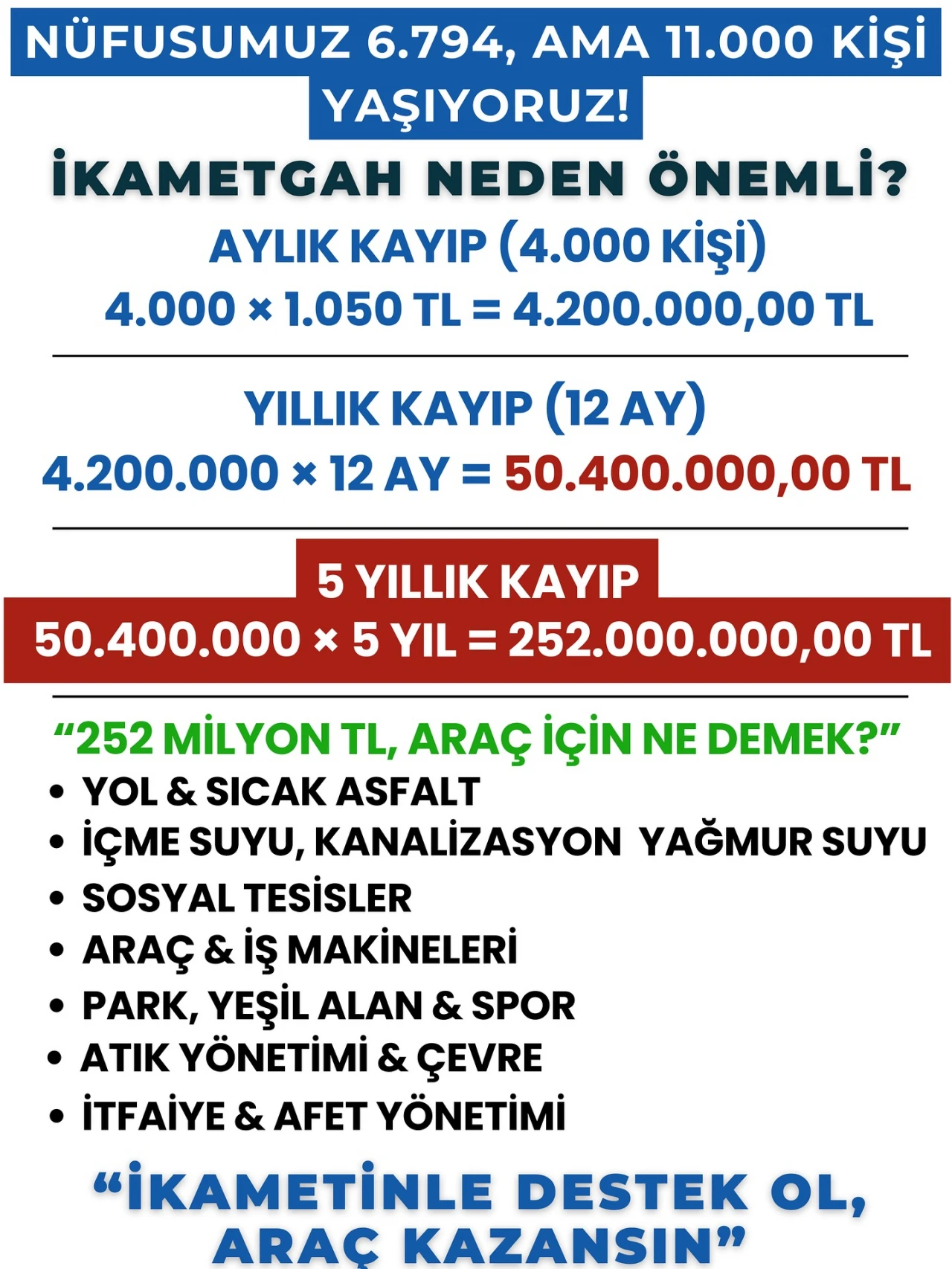 Belediyeden yapılan açıklamada, Araç’ta yaklaşık 11 bin kişinin yaşadığı, ancak resmi nüfusun 6 bin 794 olarak kayıtlarda yer aldığı belirtildi. Belediyenin hesaplamalarına göre ilçede 4 bin kişinin ikametgahının başka yerlerde bulunması, her ay 4 milyon 200 bin TL, yılda ise 50 milyon 400 bin TL kaynak kaybına neden oluyor.