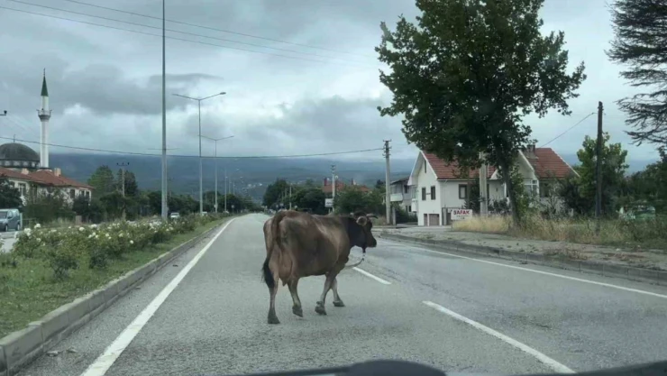 Bolu-Karacasu kara yolunda yolun ortasından giden inek trafiği tehlikeye düşürdü. O anlar kameraya yansıdı.