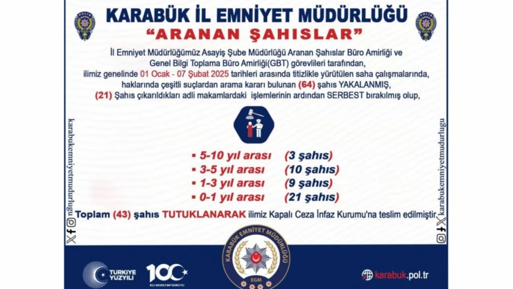 Karabük İl Emniyet Müdürlüğü Asayiş Şube Müdürlüğü Aranan Şahıslar Büro Amirliği ve Genel Bilgi Toplama Büro Amirliği (GBT) ekipleri tarafından il genelinde 1 Ocak - 7 Şubat tarihleri arasında yapılan saha çalışmalarında, haklarında çeşitli suçlardan aramaları bulunan 64 şahıs yakalandı. Yakalanan şahıslardan 21’i tamamlanan işlemlerinin ardından serbest bırakıldı. 0-1 yıl arası aranması olan 21 şahıs, 1-3 yıl arası 9 şahıs, 3-5 yıl arası aranması olan 10 şahıs, 5-10 yıl arası aranması olan 3 şahıs olmak üzere toplam 43 şahıs tamamlanan işlemlerinin ardından tutuklanarak Karabük Ceza İnfaz Kurumuna teslim edildi.
