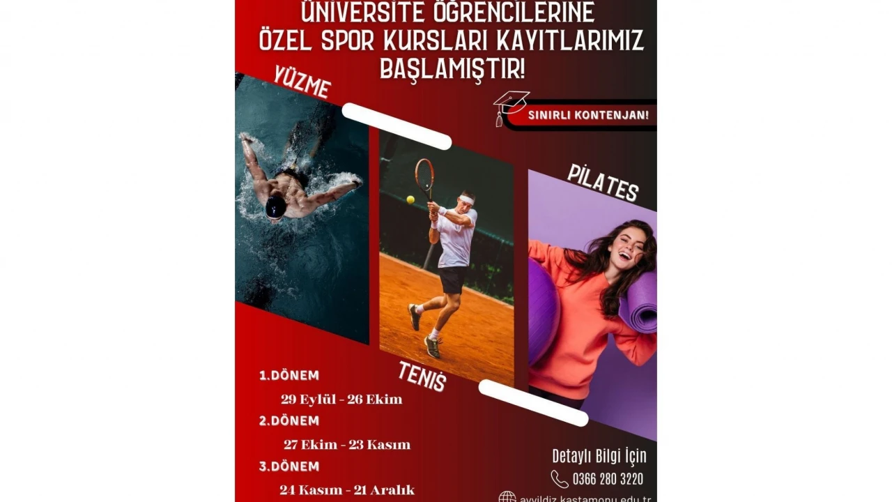 Kastamonu Üniversitesi Ayyıldız Spor ve Yaşam Merkezi'nde öğrencilere özel yüzme, pilates ve tenis kursları açılacak.