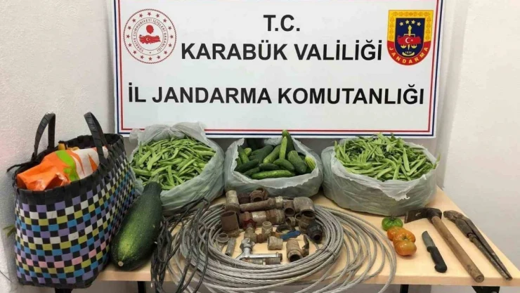 Karabük'ün Safranbolu ilçesinde bir evin bahçesine hırsızlık amaçlı giren 2 kişi, az miktarda para edecek hurda malzemelerle yetinmeyince, bahçede etkili olan salatalık, fasulye, domates ve kabakları toplayarak kaçarken jandarma tarafından kıskıvrak yakalandı.