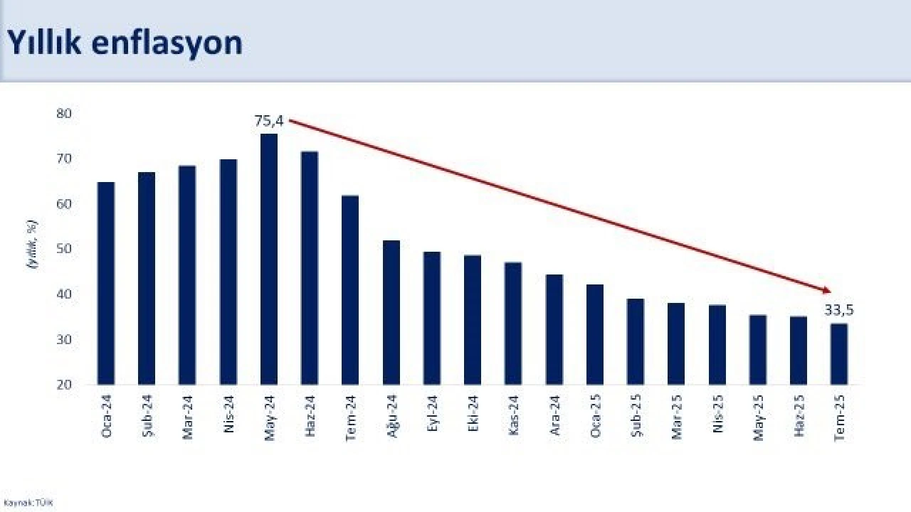 Dezenflasyon sürecinin hedeflerinin doğrultusunda ilerlediğine dikkati çeken Şimşek, açıklamasında: "Enflasyon 44 ayın en düşük seviyesinde. Aylık enflasyon temmuzda geçici ve dönemsel etkilerle yüzde 2,06 gerçekleşirken yıllık enflasyon son 12 ayda 28,3 puan düşüşle yüzde 33,5’e geriledi. Yıllık gıda enflasyonu yüzde 28, temel mal enflasyonu yüzde 20,7 oldu. Hizmet enflasyonu üç yılı aşkın sürenin ardından ilk kez yüzde 50’nin altına indi. Dezenflasyon süreci hedeflerimiz doğrultusunda ilerlemektedir. Yıl sonunda enflasyonun TCMB’nin tahmin aralığında gerçekleşeceğini öngörüyoruz. Enflasyondaki düşüş, öngörülebilirliği artırarak yurtiçi finansal şartların ve yatırım ortamının daha da iyileşmesine katkı sağlayacaktır. Temel önceliğimiz olan kalıcı fiyat istikrarını sağlamak için programımızı kararlılıkla uygulamaya devam edeceğiz” dedi.