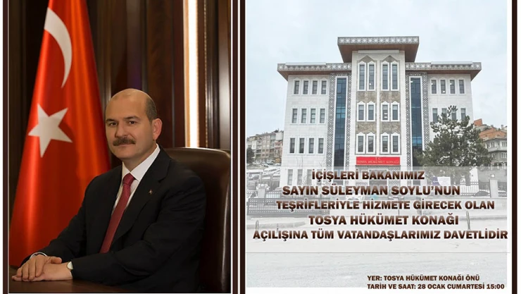 İçişleri Bakanı Süleyman Soylu, yarın Tosya'da gerçekleşecek olan Hükümet Konağı'nın açılışına katılacak. Yarın ilimize gelecek olan İçişleri Bakanı Süleyman Soylu, ilçede yapımı tamamlanan Tosya Hükümet Konağı'nın açılışını gerçekleştirecek. Saat 15.00'da gerçekleşecek açılış ile Tosya Hükümet Konağı'nın ilk resmi konuğa da İçişleri Bakanı Süleyman Soylu olacak. E.P.