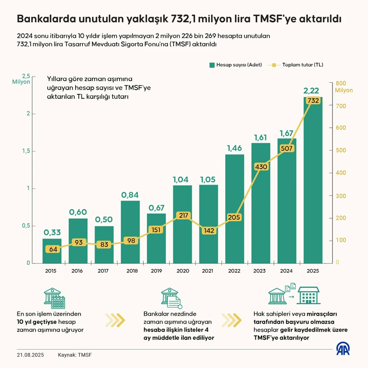 Bankalar nezdinde hak sahipleri tarafından yapılan en son işlem, talep veya yazılı talimat tarihinden itibaren 10 yıl süreyle aranmayan her türlü mevduat, katılım fonu, emanet ve alacaklar zaman aşımına uğruyor ve gelir kaydedilmek üzere Tasarruf Mevduatı Sigorta Fonu'na (TMSF) aktarılıyor. Bu yıl itibarıyla, en son 2014'te işlem görmüş olan hesapların Fon'a devri gerçekleştirildi. Bankalar tarafından zaman aşımına uğrayan hesaplarla ilgili olarak yapılan ilanlar doğrultusunda, hak sahipleri veya mirasçıları tarafından 15 Haziran'a kadar aranmayan hesaplar TMSF'ye devredildi.