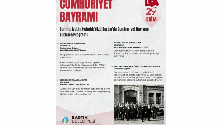 Haberler Bartın Bartın'da Cumhuriyet Bayramı Programı Bartın'da Cumhuriyet Bayramı Programı Bartın Belediyesi, 29 Ekim Cumhuriyet Bayramı etkinlik programını sosyal medya hesabından duyurdu. bartın PAYLAŞ 23.10.2024 22:30 Güncelleme: 23.10.2024 22:30 Muhammed TüsüzMuhabir TAKİP ET Bartın Belediyesi'nin paylaşımına göre, 23 Ekim Çarşamba günü Kitap Fuarı ile başlayacak etkinlikler şu şekilde devam edecek: Bu Habere de Bak Prof. Dr. Fuat Sezgin, İnebolu’da Da Anlatıldı bartın bartın belediyesi bartın haberleri Özel Haber Muhammed Tüsüz PAYLAŞ İlk Yorum Yazan Sen Ol! Bakmadan Geçme Bir Sözle Başladı, Bir Yıllık Emekle Hayata Geçti: 'Unutma Beni' Kastamonu'da Yangın Paniği Kastamonu'da Korkutan Kaza! Uyuşturucu Madde Ele Geçirildi 1 Puanı Ellerimizle Verdik Uyuşturucu Davasında Yargılama Devam Etti