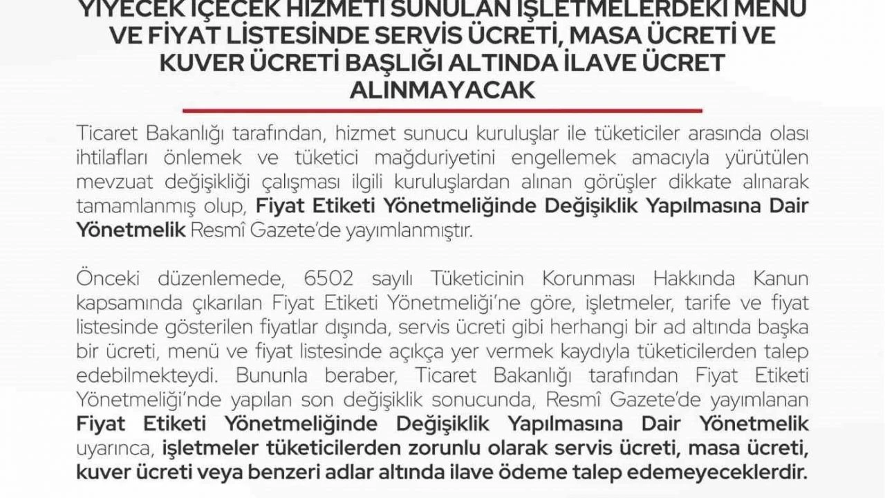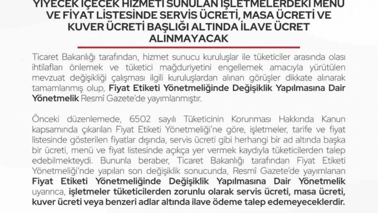 Önceki düzenlemede, 6502 sayılı Tüketicinin Korunması Hakkında Kanun kapsamında çıkarılan Fiyat Etiketi Yönetmeliği’ne göre, işletmeler, tarife ve fiyat listesinde gösterilen fiyatlar dışında, servis ücreti gibi herhangi bir ad altında başka bir ücreti, menü ve fiyat listesinde açıkça yer vermek kaydıyla tüketicilerden talep edebilmekteydi. Bununla beraber, Ticaret Bakanlığı tarafından Fiyat Etiketi Yönetmeliği’nde yapılan son değişiklik sonucunda, Resmî Gazete’de yayımlanan Fiyat Etiketi Yönetmeliğinde Değişiklik Yapılmasına Dair Yönetmelik uyarınca, işletmeler tüketicilerden zorunlu olarak servis ücreti, masa ücreti, kuver ücreti veya benzeri adlar altında ilave ödeme talep edemeyeceklerdir. Tüketici sadece, bahşiş gibi, gönüllük esasına dayalı ödeme yapabilecek. Tüketiciler, sipariş verdikleri yiyecek ve içeceklerin bedeli dışında, yalnızca bahşiş gibi gönüllülük esasına dayalı olarak ve kendi istekleriyle ilave ödeme yapabilecekler, tüketicilerden zorunlu bir servis ücreti, masa ücreti talep edilmeyecektir" denildi.