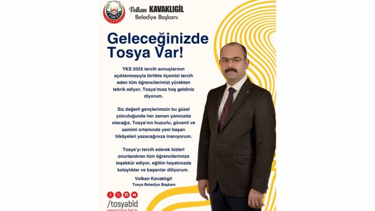 Başkan Kavaklıgil yaptığı paylaşımda; “YKS 2025 tercih sonuçlarının açıklanmasıyla birlikte ilçemizi tercih eden tüm öğrencilerimizi yürekten tebrik ediyor, Tosya’mıza hoş geldiniz diyorum. Siz değerli gençlerimizin bu güzel yolculuğunda her zaman yanınızda olacağız. Tosya’nın huzurlu, güvenli ve samimi ortamında yeni başarı hikâyeleri yazacağınıza inanıyorum. Tosya’yı tercih ederek bizleri onurlandıran tüm öğrencilerimize teşekkür ediyor, eğitim hayatınızda kolaylıklar ve başarılar diliyorum.” ifadelerine yer verdi.