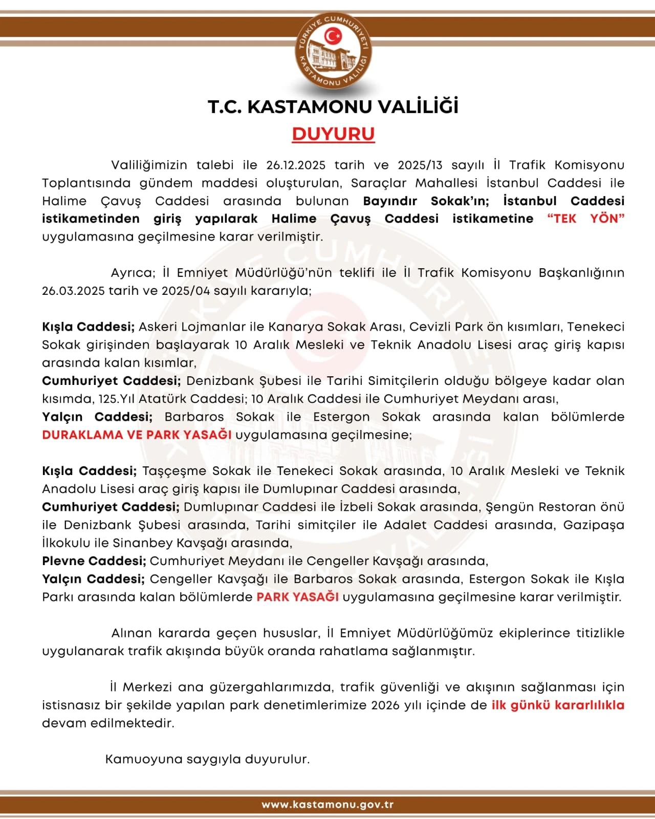 Kastamonu Valiliği tarafından yapılan duyuruya göre, İl Trafik Komisyonu'nun aldığı kararlar doğrultusunda Kastamonu kent merkezinde trafik düzenlemelerine gidildi.