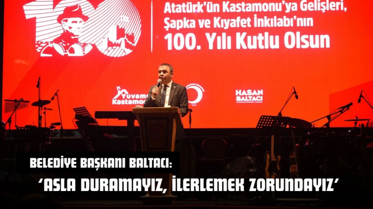Açıklamalarına devam eden Başkan Baltacı; “Mustafa Kemal'in yurt gezileri cumhuriyetin ilerlemesi açısından, devrimlerinin ilerlemesi açısından çok önemli, çok kritik gezilerdir. Bu gezilerden bir tanesinde Kastamonu'da bir hafta bulunmuştur ve bu bir hafta içerisinde bize ışık tutacak, yol gösterecek birçok söylevleri olmuştur. Bunlardan bir tanesini özellikle sizlerle paylaşmak istiyorum. 24 Ağustos 1925’te Kastamonu'da demiş ki; ‘Artık duramayız. Ne olursa olsun ileri gideceğiz. Çünkü mecburuz. Millet açıkça bilmelidir. Medeniyet öyle kuvvetli bir ateştir ki ona yabancı olanları yakar, mahveder.’ Evet bu ülkenin tam bağımsızlığı cephede kazanılmış olsa bile Cumhuriyeti ileri götürmek devrimlerine sahip çıkmak çok anlamlı, çok kıymetli. 100 yıl öncesinden bugüne bugün bu belediyeyi yönetmek üzere bize görev veren millet şunu iyi bilmeli. Asla duramayız. İlerlemek zorundayız. Kastamonu Türkiye'den bir adım geride olamaz. Türkiye dünyadan bir adım geride olamaz. Bize verdiğiniz görevden bugüne yaklaşık 16 aydır bu belediyeyi bir avuç rantiyenin değil bir avuç çıkar grubunun değil halkın belediyesi yapmak için gece gündüz çalışıyoruz. Çalışma arkadaşlarıma buradan sizlerin huzurunuzda bir kez daha teşekkür ediyorum. Yaptığımız her şey bu güzel memleketin Yuvamız Kastamonu'nun çocukları, gençleri başta olmak üzere hiç kimse geride kalmasın diye. Kreşler açıyoruz. Bu şehrin çocukları eğitimden, kreşten mahrum kalmasın diye. Dershane açıyoruz. Bu şehrin gençleri eğitimden mahrum kalmasın. Üniversiteye gidebilsin, hayallerindeki bölüme kavuşabilsin diye uğraşıyoruz. Ulaşım sistemini yeniden düzenliyoruz. Bu şehrin insanları daha saygın, daha konforlu bir ulaşıma sahip olsunlar diye. Alt yapı için uğraşıyoruz, üst yapı için uğraşıyoruz” ifadelerini kullandı.