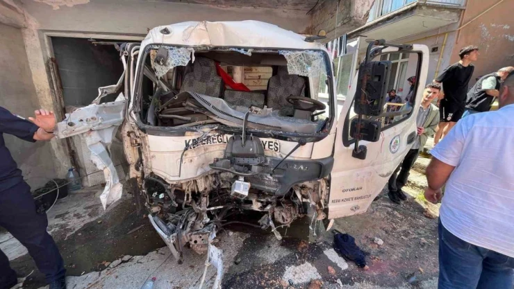 Zonguldak'ın Ereğli ilçesinde freni patlayan kamyonet, önce elektrik direğine çarptı ardından bir garaja girerek durabildi. Kazada 2 kişi yaralandı.