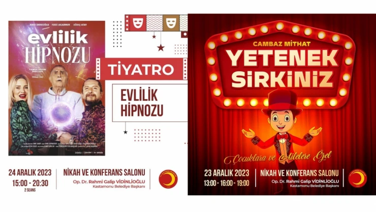 23 Aralık Cumartesi günü Kastamonu Belediyesi Nikah ve Konferans Salonu’nda saat 13.00, 16.00 ve 19.00’da 3 seans olarak ‘Cambaz Mithat ile Yetenek Sirkiniz’ adlı gösteri oyunu çocuklar ve aileleriyle buluşacak. 24 Aralık Pazar günü ise yine Nikah ve Konferans Salonu’nda saat 15.00 ve 20.00’da olmak üzere 2 seans ‘Evlilik Hipnozu’ isimli tiyatro oyunu sahnelenecek. Ücretsiz olarak gerçekleştirilecek etkinliklerde usta tiyatro oyuncuları sahne alacak.