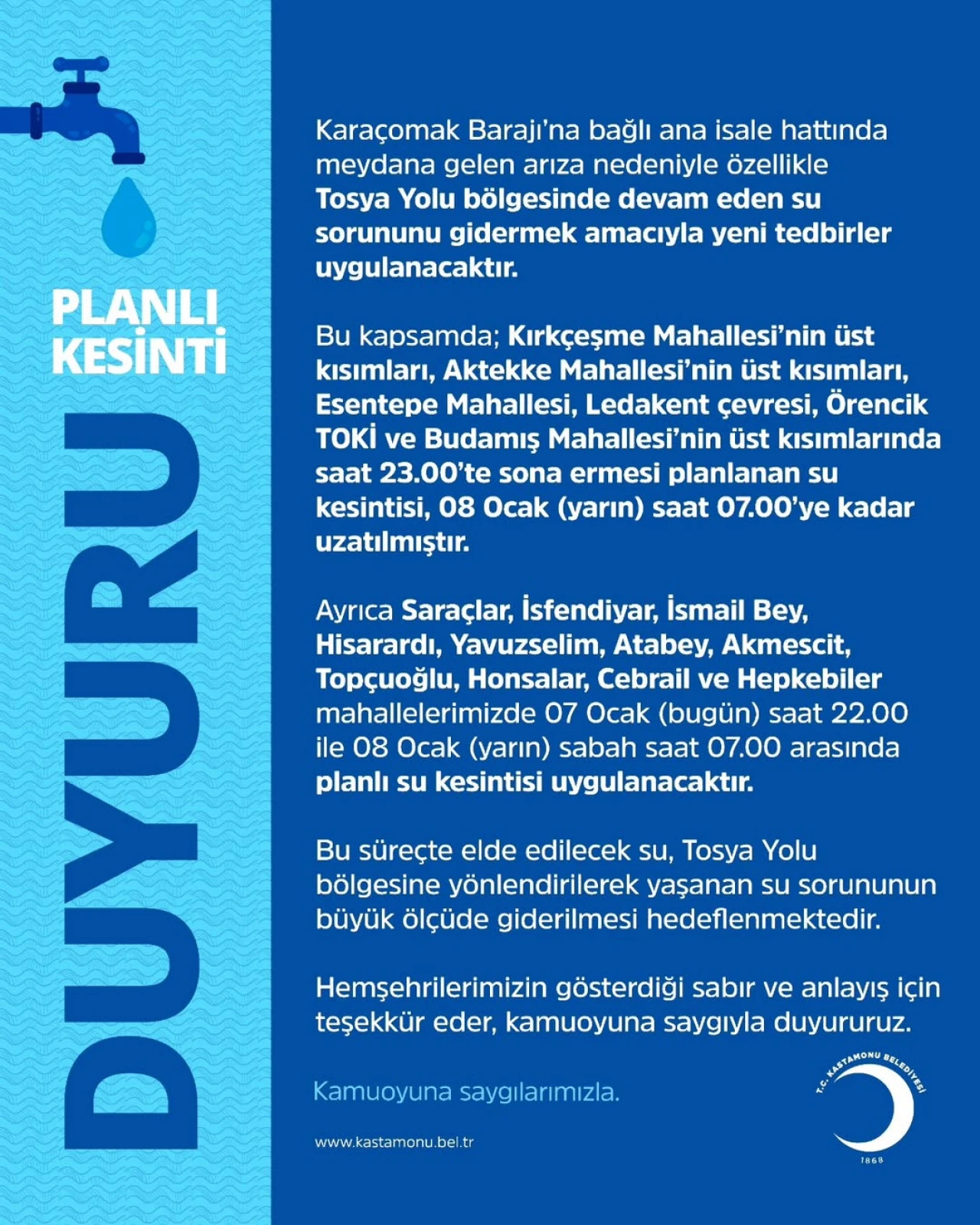 Belediyeden yapılan duyuruda, özellikle Tosya Yolu bölgesinde yaşanan su sorununu gidermek amacıyla yeni tedbirlerin devreye alındığı belirtildi. Bu kapsamda Kırkçeşme Mahallesi’nin üst kısımları, Aktekke Mahallesi’nin üst kısımları, Esentepe Mahallesi, Ledakent çevresi, Örencik TOKİ ve Budamış Mahallesi’nin üst kesimlerinde saat 23.00’te sona ermesi planlanan su kesintisinin, 8 Ocak Perşembe günü saat 07.00’ye kadar uzatıldığı bildirildi.