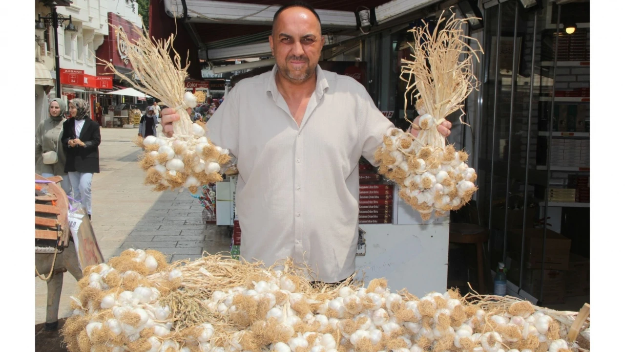 Bintelli Çekme Helva çalışanı Ayhan Demir, tezgahların vazgeçilmezi Taşköprü sarımsağı hakkında açıklamalarda bulunarak sarımsağın tezgah ve pazarları canlandırdığını belirtti.