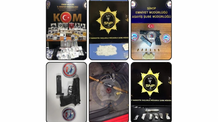 Sinop İl Emniyet Müdürlüğü personeli tarafından 3 Haziran ile 3 Temmuz tarihleri arasında genel güvenlik ve asayişin temini açısından yürütülen şok uygulamaların raporu yayınlandı. Rapora göre 1 ayda yapılan asayiş kontrollerinde 33 aranan şahıs yakalandı, 13 kişi tutuklandı, 14 adet ruhsatsız tabanca, 3 adet av tüfeği ile 258 adet fişek ele geçirildi. Kaçakçılık operasyonlarında piyasaya sürülmek üzere hazırlanan 46.5 litre sahte alkol, 302 adet gümrük kaçağı elektronik eşya ele geçirildi. Kent merkezinde yürütülen uyuşturucu operasyonlarında ise 35 kök Hint keneviri, 12,38 gram esrar, 5,7 gram bonzai ve 1,76 gram kokain ele geçirildi.