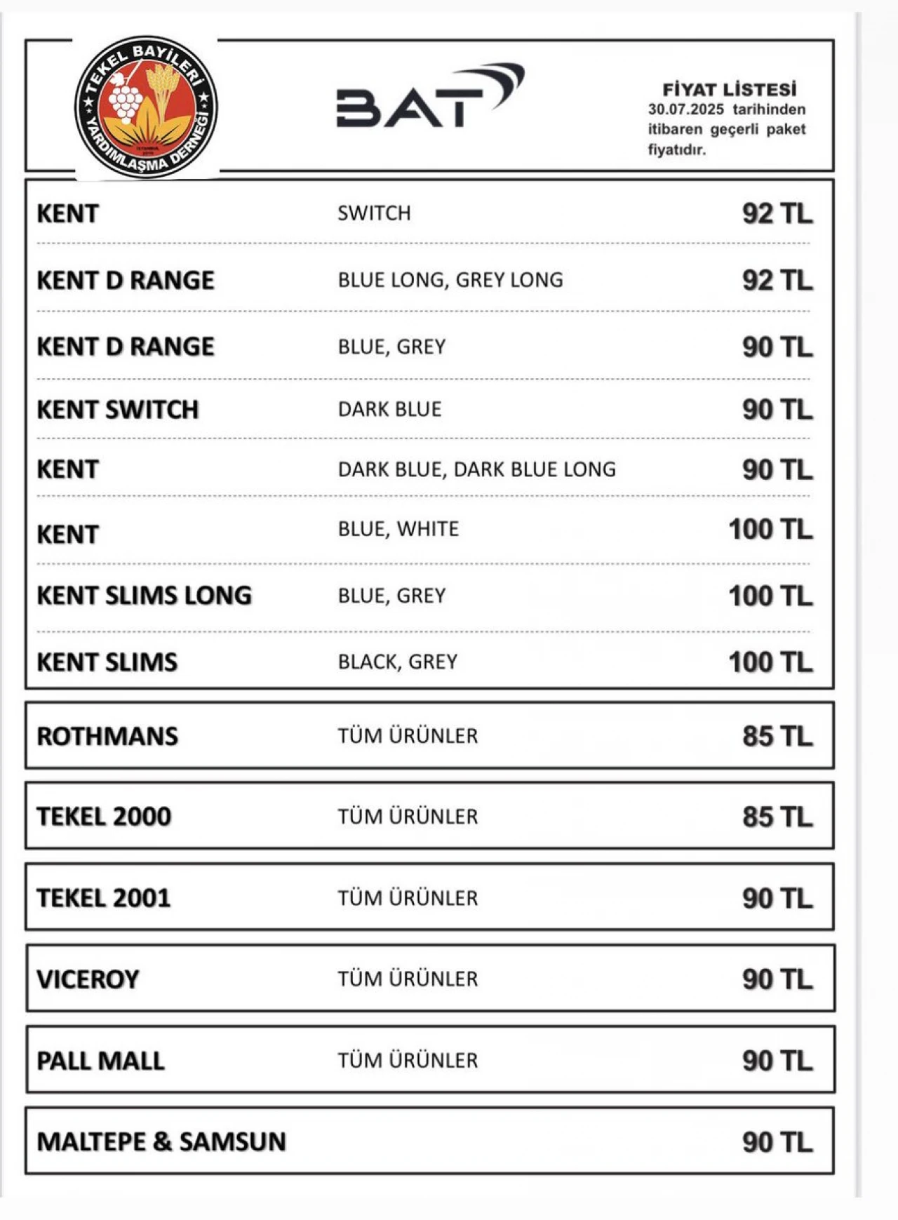 British American Tobacco (BAT) grubuna ait sigara markalarına 30 Temmuz 2025 itibarıyla geçerli olmak üzere 5 TL zam yapıldı. Böylece bazı ürünlerin fiyatı 100 TL'ye ulaştı.