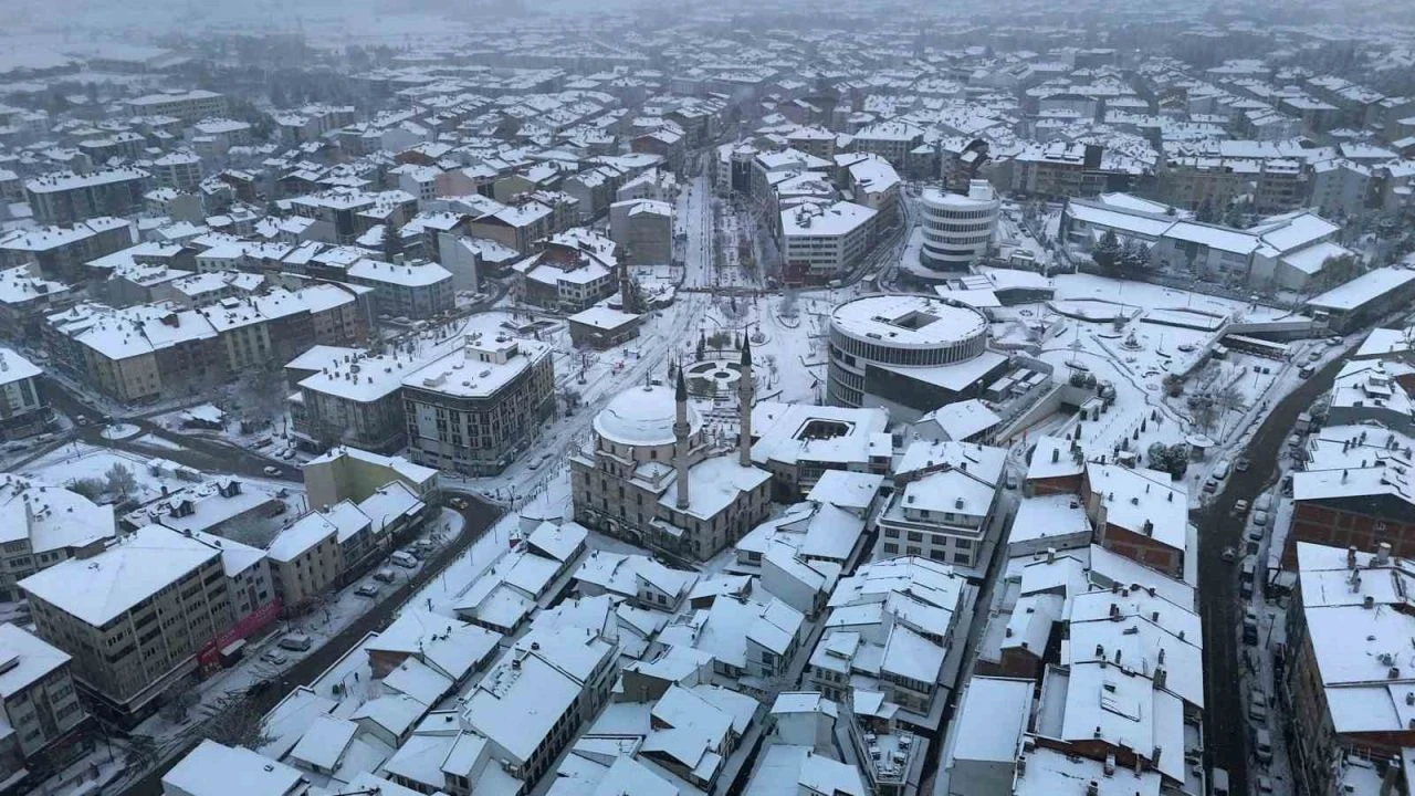 Kentte dün akşam saatlerinde başlayan sağanak, gece yerini kar yağışına bıraktı. Aralıklarla sabaha kadar devam eden yağışın ardından kent merkezi tamamen beyaz örtüyle kaplandı. Kent merkezinde kar kalınlığı 10 santimetre olarak ölçüldü. Güne beyaz örtüyle uyanan vatandaşlar, araçlarının üzerindeki karları temizledi. Parklar, bahçeler ve binaların çatıları karla kaplanırken, ortaya kartpostallık görüntüler çıktı. Şehrin ’beyaz gelinliğini’ giymiş hali ve beyaza bürünen simge noktaları havadan dron ile görüntülendi.