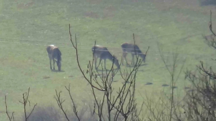 Bolu’nun Mudurnu ilçesinde ormanlık alanlardaki kar birikintileri sebebiyle yiyecek bulamayan geyikler, köylere inerek ekili arazilerde otlandı.