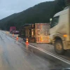 Bolu'nun Göynük ilçesinde odun yüklü tır kayganlaşan yolda devrildi.