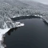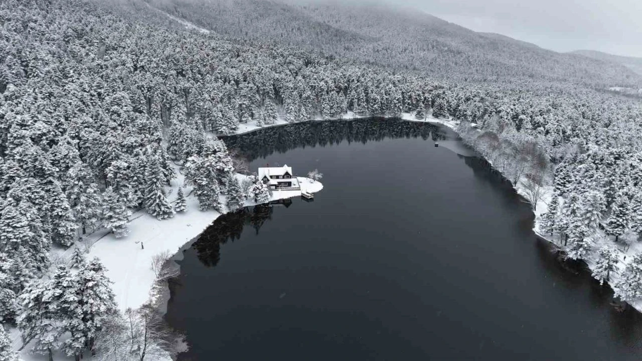 Bolu’nun doğa harikası Gölcük Tabiat Parkı, kar yağışının ardından beyaz gelinliğini giydi. Çam ormanlarının arasındaki saklı cennetin beyaz örtüyle kaplandığı kartpostallık manzara, havadan dron ile görüntülendi.