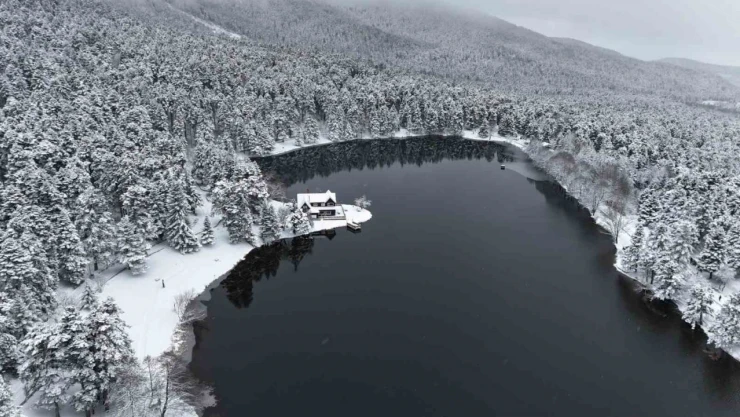 Bolu kent merkezine yaklaşık 13 kilometre uzaklıkta bulunan ve her mevsim yerli ve yabancı turistlerin uğrak noktası olan Gölcük Tabiat Parkı’nda, etkili olan kar yağışı sonrası seyrine doyumsuz manzaralar oluştu. Hava sıcaklığının sıfırın altına düştüğü bölgede, gölün çevresini saran çam ormanları ve simge haline gelen Devlet Konukevi tamamen beyaza büründü. ‘Beyaz gelinliğini’ giyen tabiat parkı, havadan dron ile görüntülendi. Ortaya çıkan kartpostallık manzaralar, görenleri hayran bıraktı.