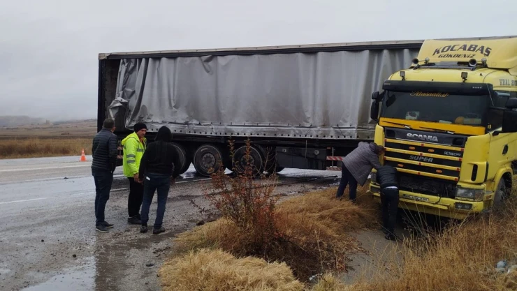 Çorum’un Alaca ilçesinde sürücüsünün direksiyon hakimiyetini kaybettiği tır makasladı. Kazada sürücü yara almadan kurtuldu.