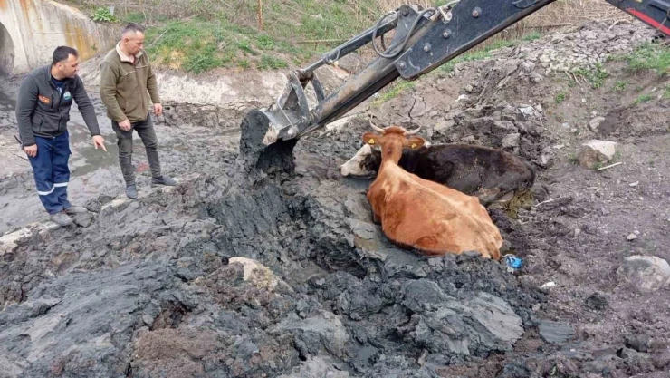 Çamura Saplanan İnekler Kepçeyle Kurtarıldı