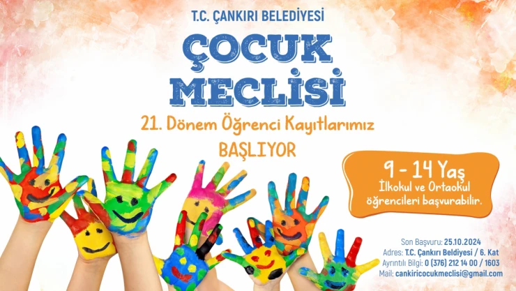 Çankırı Belediyesi’nin sosyal medya hesabında yaptığı paylaşımda şu ifadelere yer verildi: “21. Dönem Çocuk Meclisi Öğrenci Kayıtları Başlıyor.