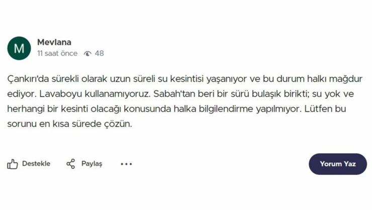 Son olarak dün yaşanan su kesintisi ile ilgili Çankırı Belediyesi’nin sosyal medya hesaplarından yapılan açıklamada, “Ana beslenme hattımızda sabah saatlerinde çıkan ani arıza nedeni ile Aksu Mahallesi alt kesimleri, Yeni Mahalle alt kesimleri, A.H.R. Mahallesi Yanlar Caddesi Küçük Sanayi ve Göç İdaresine kadar olan yerlerin suları kesilmiştir. Ekiplerimiz, arızanın giderilmesi ve suların tekrar verilebilmesi için çalışmalarına devam etmektedir” ifadelerine yer verildi.