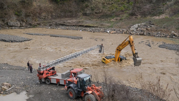 Bozkurt’ta debisi yükselen Ezine Çayı'nda mahsur kalan ekskavatör operatörü itfaiye merdiveniyle kurtarıldı.