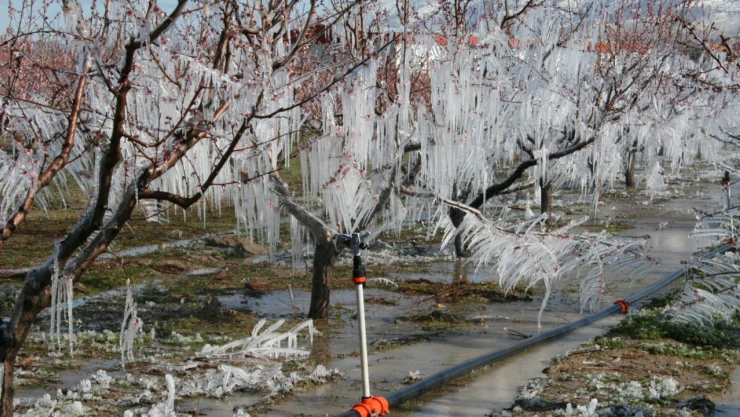 Mart ayının son günü hava sıcaklığının mevsim normalleri altına düşmesi ve gece yaşanan don olayından meyve ağaçlarını korumak isteyen meyve üreticileri ağaçları buz tutturarak dondan korumaya çalıştı. Özellikle şeftali ağaçlarının dalları ve çiçeklerine yağmurlama ve mini spring sistemi ile gece boyu su veren çiftçiler çiçekleri korumaya hedefliyor. Buz ağacına dönen şeftali ağaçlarını görenler şaşkınlıklarını gizleyemezken, yoldan geçen bazı sürücülerde gördükleri bu manzarayı fotoğraflamayı ihmal etmiyor.