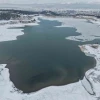 Çorum'da beyaza bürünen ve yüzeyi kısmen buz tutan Çomar Barajı, görsel şölen oluşturdu.