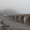 Çorum’un Osmancık ilçesinde sabah saatlerinde etkili olan yoğun sis, ilçenin simgesi tarihi Osmancık Kalesi, tarihi köprüde kartpostallık görüntüler oluşturdu.