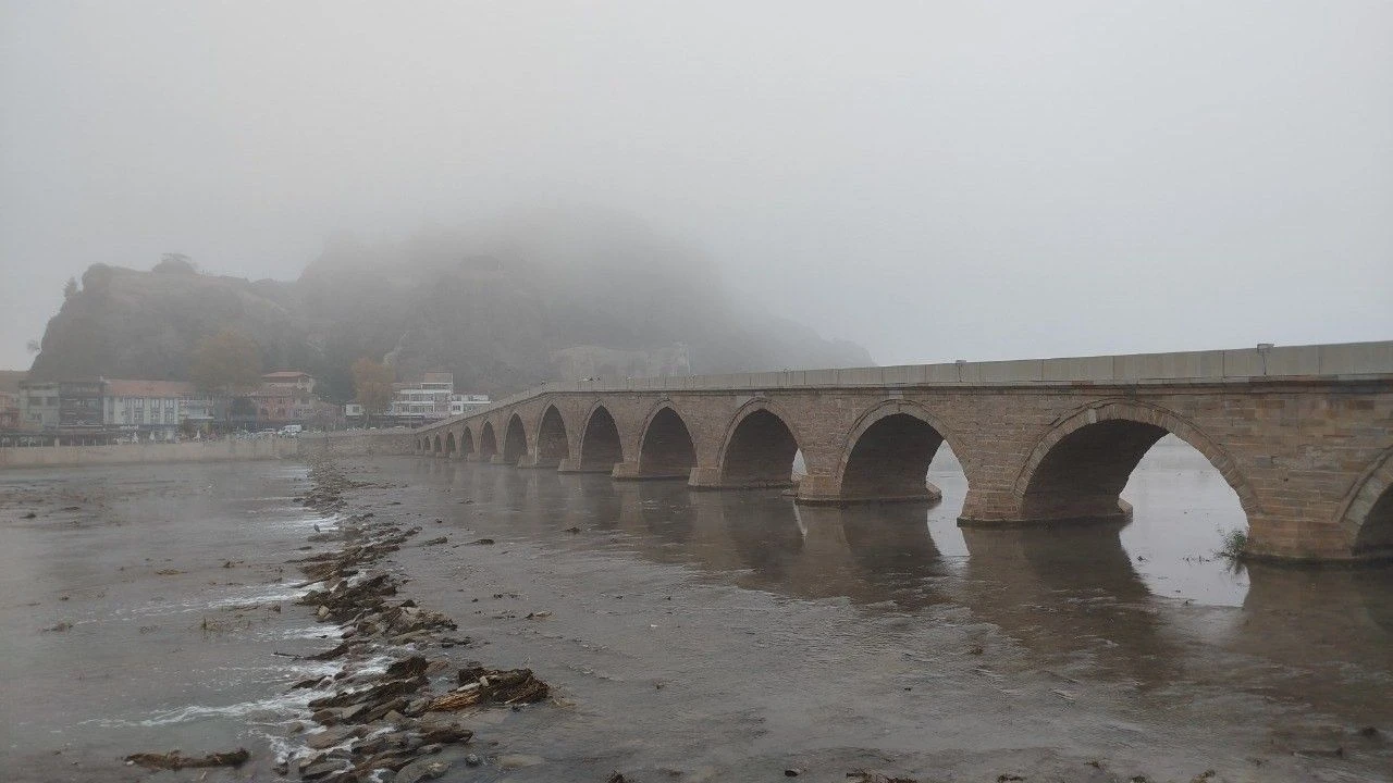 Çorum'un Osmancık ilçesinde sabah saatlerinde etkili olan yoğun sis, ilçenin simgesi tarihi Osmancık Kalesi, tarihi köprüde kartpostallık görüntüler oluşturdu.