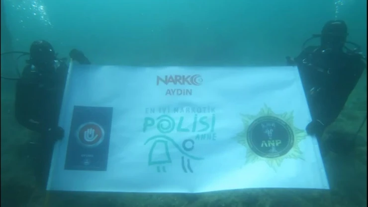 Aydın Narkotik Suçlarla Mücadele Şube Müdürlüğü ekipleri, 'En iyi narkotik polisi Anne' sloganını deniz altında açtıkları pankartla duyurarak, uyuşturucunun zararlarına dikkat çekti.