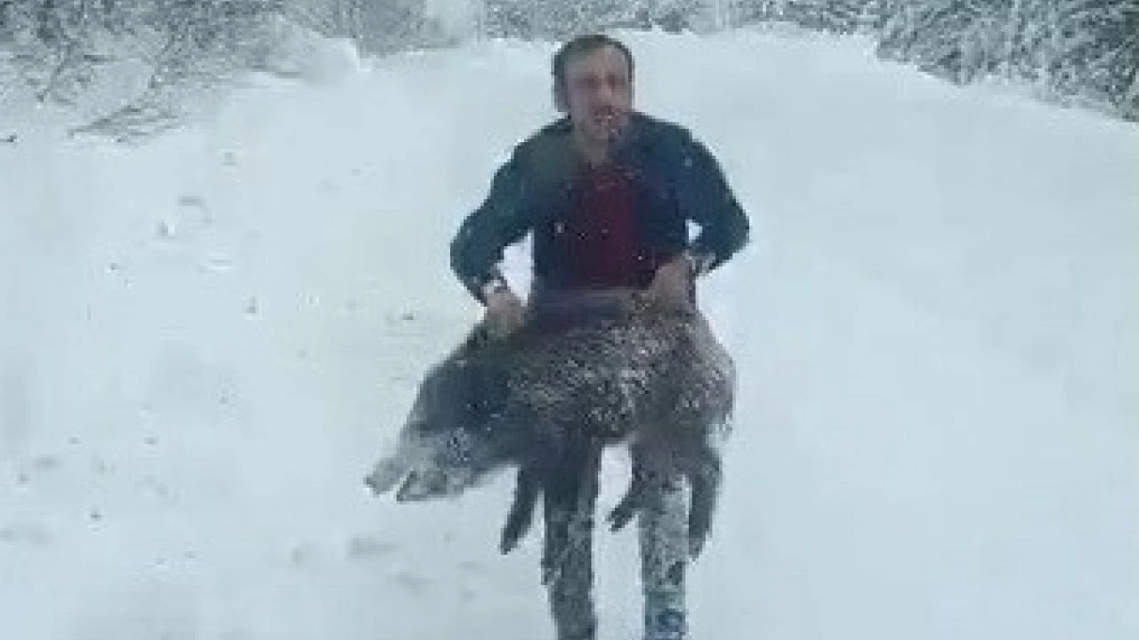 Sinop’un Erfelek ilçesinde karlı yolda karşılaştığı yaban domuzu sürüsünden bir yavruyu araçtan inerek kovalayıp eliyle yakalayan vatandaş, sosyal medyada büyük yankı uyandıran görüntülere ilişkin konuştu.