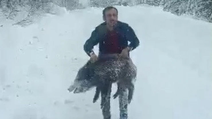 Sinop'un Erfelek ilçesinde karlı yolda karşılaştığı yaban domuzu sürüsünden bir yavruyu araçtan inerek kovalayıp eliyle yakalayan vatandaş, sosyal medyada büyük yankı uyandıran görüntülere ilişkin konuştu.