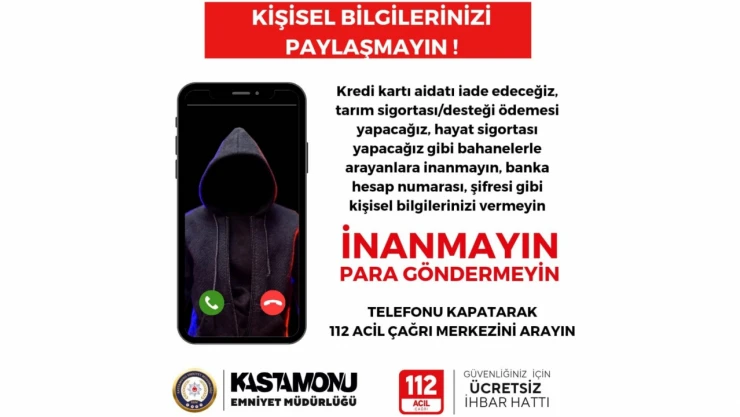 Kastamonu İl Emniyet Müdürlüğü dolandırıcılık olaylarına karşı uyarılarına devam ediyor. Emniyet Müdürlüğü vatandaşları kişisel bilgilerin paylaşılmaması konusunda uyardı.