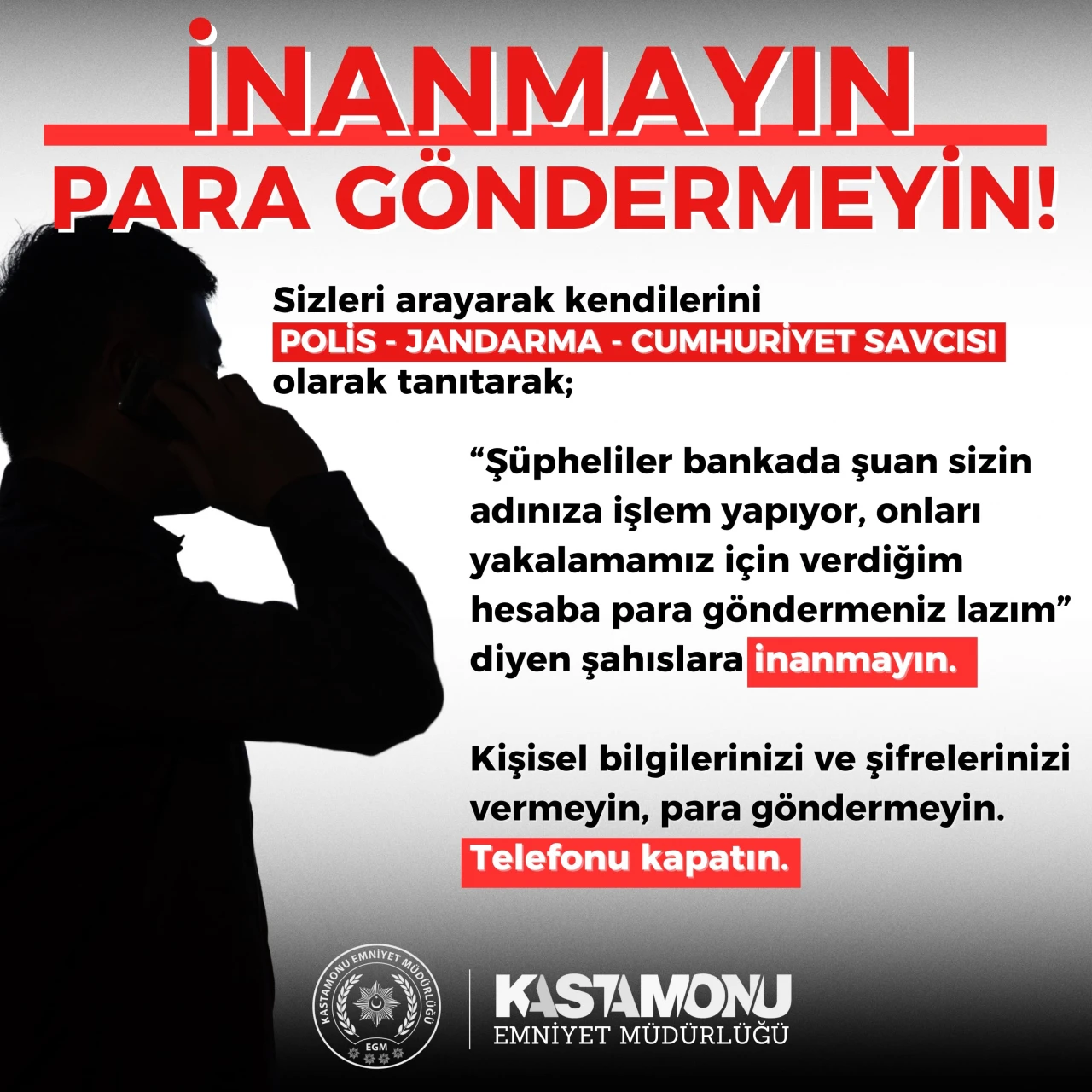 Kastamonu İl Emniyet Müdürlüğü, kendini polis, jandarma ve Cumhuriyet Savcısı olarak tanıtan ve para isteyen dolandırıcılara karşı vatandaşlara para, kişisel bilgi ve şifrelerini vermemeleri uyarısında bulundu.