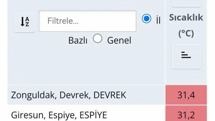"Zonguldak, Devrek: 31,4 derece, Giresun, Espiye: 31,2 derece, Zonguldak, Çaycuma: 30,8, Rize, Çayeli 30,5 derece, Giresun, Yağlıdere: 30 derece, Bartın, Merkez: 30 derece, Ordu, Altınordu: 30,0 derece, Bartın, Merkez (Kozcağız): 30,0 derece."