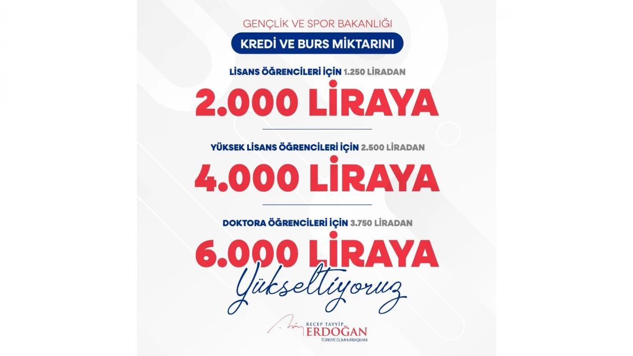 Erdoğan, yüksek öğrenim gören öğrenciler için 2024 yılı kredi ve burs miktarını açıkladı. Erdoğan konuyla ilgili şunları söyledi: "Kredi veya burs alan 1 milyon 600 bin öğrencimize 2024 yılı kredi burs rakamı lisans öğrencilerine 2000 TL'ye yüksek lisans öğrencileri için 4 bin TL'ye çıkarıyoruz."
