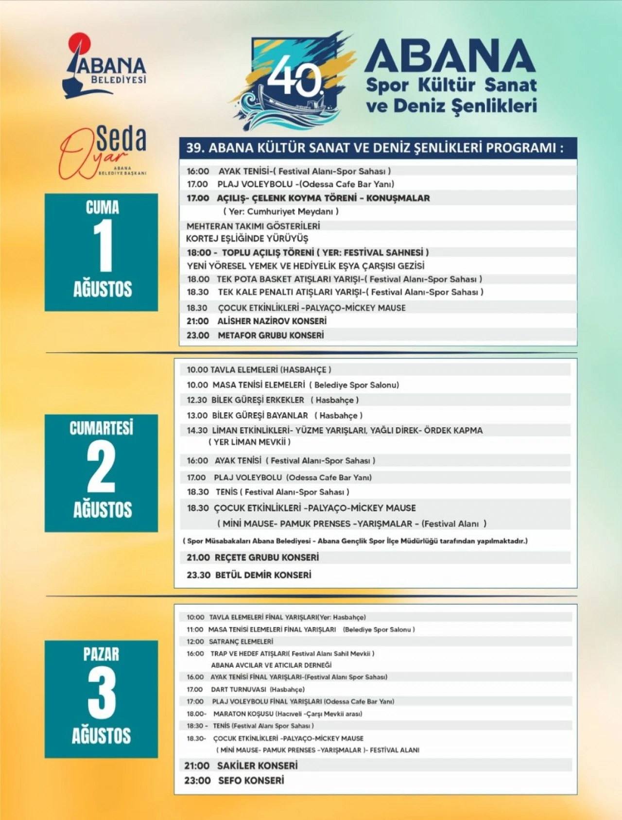 Abana Belediyesi'nin bu yıl 39'uncusunu düzenlediği Kültür, Sanat ve Deniz Şenlikleri'nin programı belli oldu. 1-2-3 Ağustos tarihlerinde spor, eğlence ve müzik dolu etkinlikler vatandaşlarla buluşacak.
