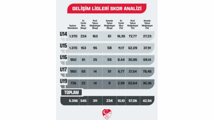 Gelişim Ligleri; genç millî takımların oyuncu havuzunu oluşturan, profesyonel futbola geçiş sürecinde en kritik rekabet ortamını sunan ve ülke futbolunun geleceğini doğrudan şekillendiren en önemli organizasyonlardan biridir. Bu doğrultuda, ligin sportif kalitesini koruyarak oyuncu havuzunu genişletmek; Türkiye genelinde daha fazla oyuncu ve antrenöre ulaşmak Türkiye Futbol Federasyonu için stratejik bir öncelik taşımaktadır. Türkiye Futbol Federasyonu Futbol Gelişim Direktörlüğü, hem katılımı zorunlu olan 2. ve 3. Lig profesyonel kulüplerin hem de Gelişim Liglerinde yer alan amatör kulüplerin performanslarını sezon sonunda bütüncül bir bakış açısıyla ele alarak, çok yönlü gelişimi destekleyen, rekabeti artıran ve liglerin sportif kalitesini koruyan kararlar alarak planlamalar yapacaktır. 15 Ağustos - 15 Aralık itibarıyla ilk devresi tamamlanan Gelişim Ligleri'nin kategori bazında oynanan maç sayıları ile profesyonel / amatör kulüplerin alt yaş grubu takımlarının müsabaka sonuçlarına/skorlarına (5 üzeri gol ile biten müsabakalar) göre takım dengelerine de ışık tutabilecek veri analizini içeren tabloya erişim sağlanabilir.