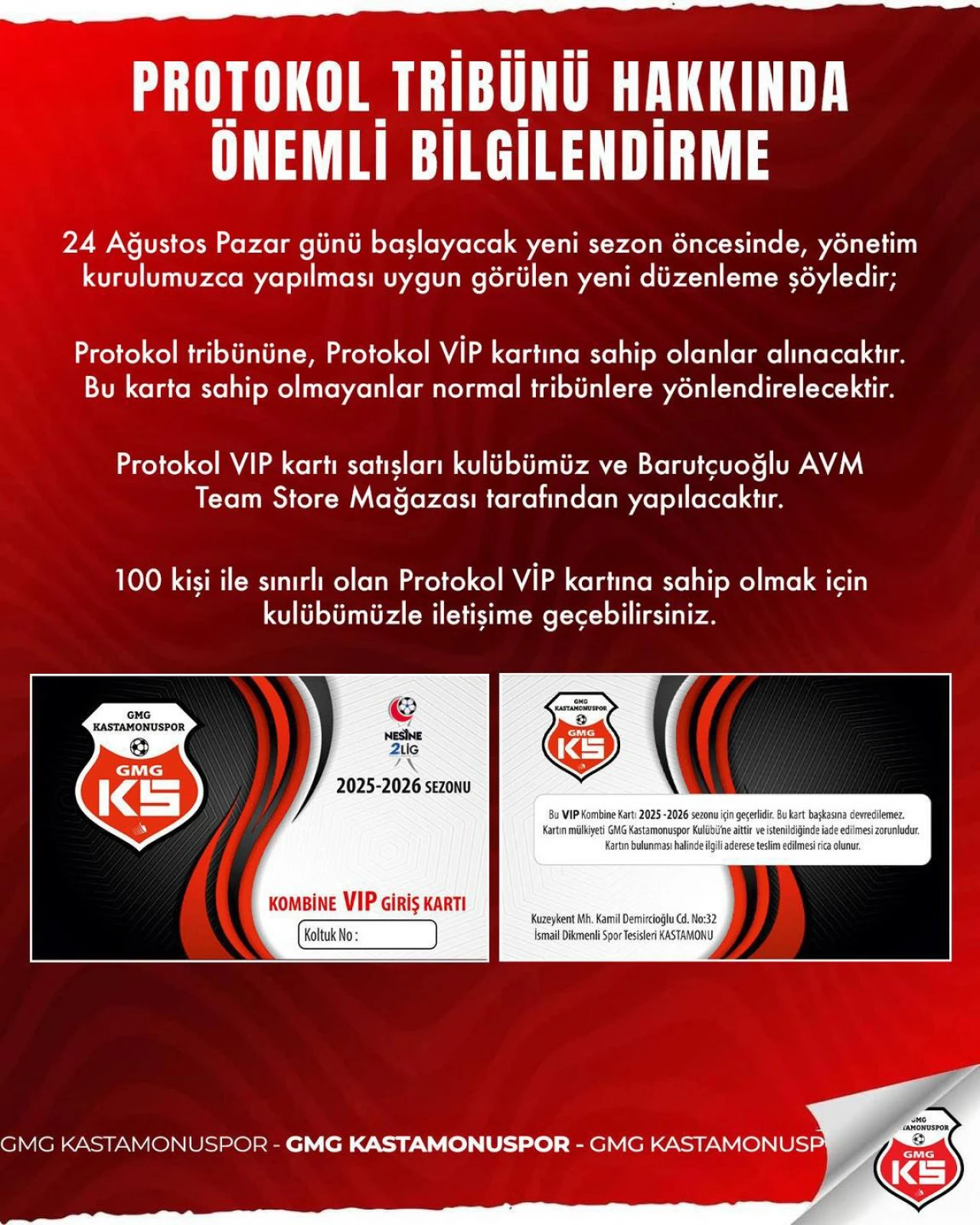 Kulüp tarafından yapılan açıklamada, Protokol VİP Kartı satışlarının GMG Kastamonuspor Kulübü ve Barutçuoğlu AVM Team Store Mağazası üzerinden gerçekleştirileceği bildirildi.