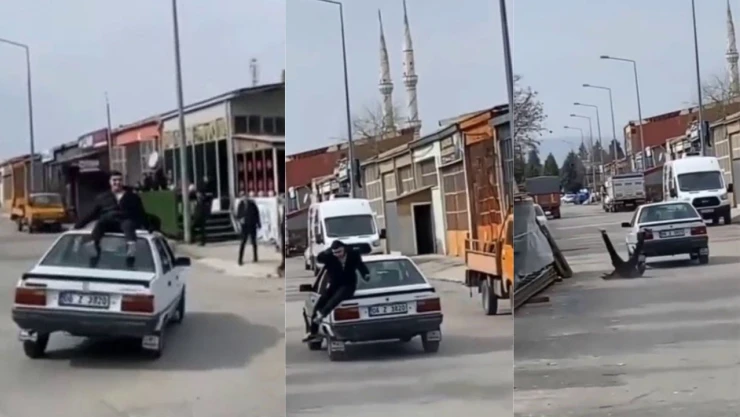 Çorum'da hareket halindeki otomobilin tavanına çıkan genç, araçtan düşerek yaralandı. O anlar cep telefonu kamerasına yansıdı