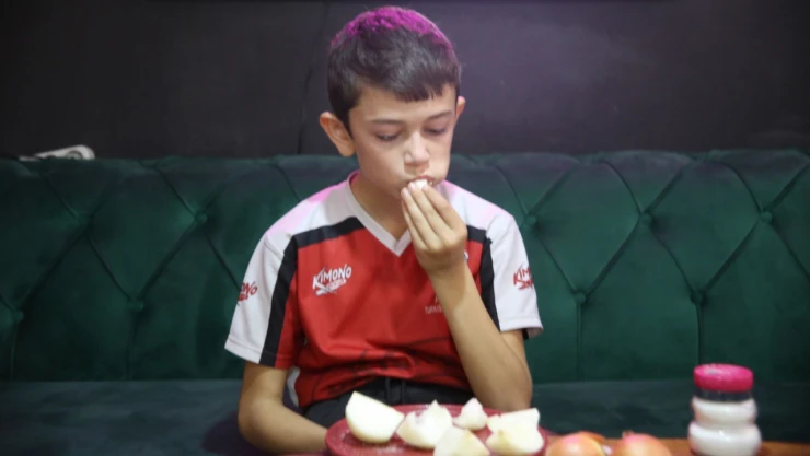Soğan ve sarımsak bağımlısı Eymen, "Çocukluğumdan beri soğan ve sarımsak yiyorum. Arkadaşlarım okulda 'bir koku var' diyorlar ama benden geldiğini anlayamıyorlar. Soğan ve sarımsak yedikçe kendimi daha güçlü hissediyorum ve hiç hasta olmuyorum" diye konuştu.