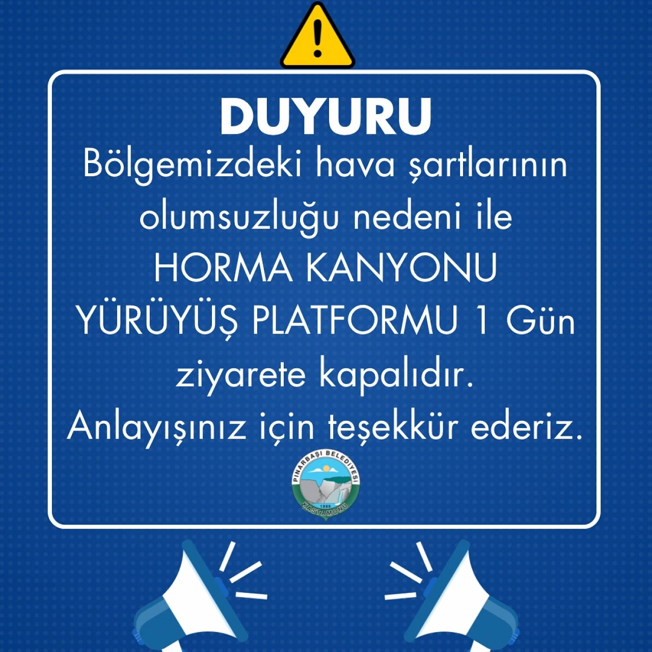Pınarbaşı Belediyesi tarafından yapılan açıklamada, kanyonun güvenlik gerekçesiyle 1 gün boyunca kapalı olacağı bildirildi. Vatandaşların anlayış göstermesi istenirken, hava koşullarının normale dönmesiyle birlikte platformun yeniden ziyaretçilere açılacağı belirtildi.